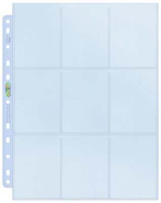 Ultra PRO Silver Series Pages in nine-pocket style. Archival quality pages that holds standard sized cards with 2-1/2" X 3-1/2" dimensions or smaller. Pages are clear on both sides with 11-hole punched on the spine for flexible binding. • Pre-punched 11-holes on the spine • Acid-Free and No PVC • UV protection • High clarity, light-weight material • Lays flat sealing process • Toploading • Made in U.S.A. • 100 pages per display box