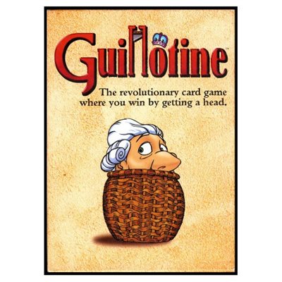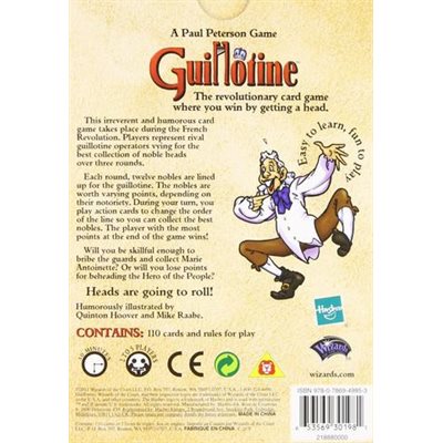 Guillotine is a card game created by Wizards of the Coast and designed by Paul Peterson. The game is set during the French Revolution, and was released on Bastille Day in 1998. The goal is to collect the heads of Nobles, accumulating points. Despite the grim topic of the game, the artwork is comical and the tone light.