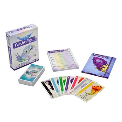 The goal in Featherlight to optimally score each feather card in your hand to gain the most points.You’ll have to swap cards cleverly and collect sets that will combine with both your private hand and the public pool of shared cards (called the nest). Each feather card can earn you points, based on which feathers you have in your hand, and which feathers are in the nest at the end of the game. Each feather color has similar scoring conditions, with slight variations from feather to feather. Some may want feather sets, while some may want odd or even numbers of feathers of a certain color. The more complex the card is to score, the more points you can earn! The player with the most points at the end wins!