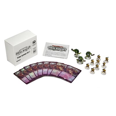 The Dungeons & Dragons Onslaught: Store Support Kit 1 - Loot Goblins and Dralm includes everything you need to run an in-store tournament for Dungeons & Dragons Onslaught! It includes suggested tournament rules and enough prizes for 8 players, including a pre-painted Loot Goblin miniature and foil monster card for each participant, and an alternate sculpt of Dralm the Sellswords Tortle Fighter for the top finishers, plus extra copies of each for the tournament organizer! Players can use their Loot Goblin miniatures to upgrade the tokens in their core sets, and their Dralm miniature to replace the standard figure in the Sellswords expansion! Contents: 3 pre-painted alternate sculpt Dralm Miniatures, 9 pre-painted Loot Goblin miniatures, 9 foil Loot Goblin Monster cards, tournament rules sheet.