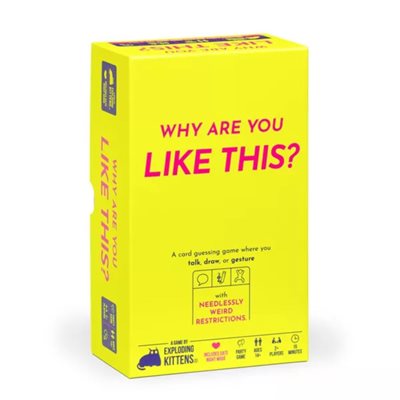 Why Are You Like This ? est un jeu de devinettes dans lequel vous parlez, dessinez ou faites des gestes.Dans Why Are You Like This ?, vous serez un peu enjoué, un peu physique et un peu bizarre avec vos coéquipiers. Le but est de faire deviner à votre équipe le plus grand nombre possible de mots secrets avant la fin du temps imparti. Pour ce faire, vous pouvez parler, dessiner ou faire des gestes. Mais il y a un piège ! Chaque carte est assortie d'une particularité qui vous rendra la tâche un peu plus difficile - et plus ridiculement amusante.